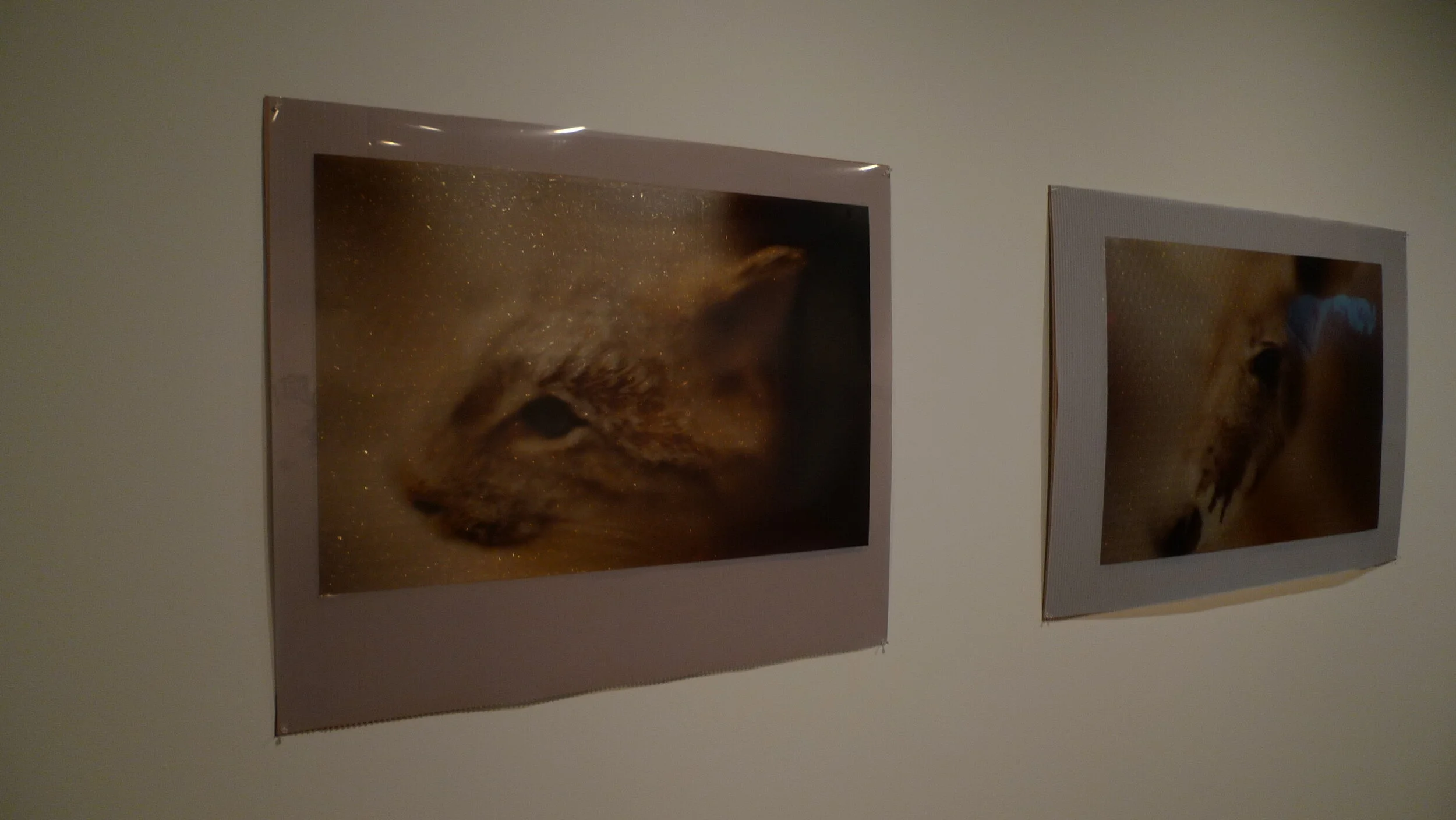 A similar sense of bio-political pathos is explored with Whiteman's video work, both pieces entitled I Saw You Standing There. The title refers to the artist's recording of an encounter between herself and a series of larger stuffed mammals, specimens that are likewisekeptin museum storage. Whiteman explained that a preliminary aspect of her process, before her performance, involves obtaining permissions, a matter that may be supported or justified by related academic and artistic activities, and one that entails navigating institutional authority. Suffice it to say that the project's critical bearing must be carefully disclosed. Even at that, the permission that is granted only goes part of the way. Whiteman obtained general access to museum storage in order to photograph various specimens, but she only touchedthem when no one was looking. The camera tracks over the the body and face of the static animal in a slow, fluid motion, always at close range and following the artist's hand (surreptitiously) raking with and against the nap of the animal's fur. Around the edges of this interaction we catch snippets of the metal cage upon which a deer, for example, is hanging by an s-hook from its rump. The importance of such overtly violent edge-work lies in the way that the storage context overcomes, even implicates commodity fetishism, as with the kind of eroticism associated with stroking a fur coat. Especially where, for example, the grizzly's face is concerned, the encounter that Whiteman stages implies a haptic communication, imbued as her action is with a close range, textural exploration. Empathy turns to pathos at the very moment that the intimate touch meets with an inert mass, an animal-become-prop for the memory of a naturalist. Whereas Maria Whiteman contemplates the capture and pathos embodied by the natural history specimen, the counter-attack staged in Clint Wilson's project targets the what Deleuze and Guatarri describe as a “Royal Science,”[2]the science of establishment and control. A case in point is Wilson's Untitled (Series), a grouping of nine colour photographs that feature labelled specimens, each named according to genus or species. The dictates of a taxonomy, a science of classification that assigns points and fixes the specimen, is also operative in a process that reduces a given animal to little more than a mnemonic device. As with Whiteman's photographic series, Wilson deploys a shallow depth of field that mostly obscures its subject, drawing tiny areas into focus with a technique that resembles the tilt-shift lens effect. What is blurred in these photographs is precisely what ordinarily functions as an explicit relation, between the specimen and its corresponding name, the coordinates that locate this once-animal as genus and species. Wilson builds a tension between the label and the specimen, playing with focus so as to posit a purposeful ambiguity, a kind of mystery seeded inside of the declaration. Untitled (Series) was mounted in solid black frames of identical dimensions, foregrounding modular and interchangeable properties in the work. In fact with prior installations Wilson has configured the series in a grid, and in some situations edited out images for space. Between the hard, regular geometry of the thick black frames and the blurry displacement of the subject photographed, another content emerges, that of an overwrought scientific determination, one that fails to grasp the complexity of the subject as a multiplicity, the mysterious subject that embodies an entire constellation of affects that enter into composition with an open, chaotic system. In Wilson's series, what escapes the taxonomic memory of the expert Naturalist is precisely this movement of becoming.